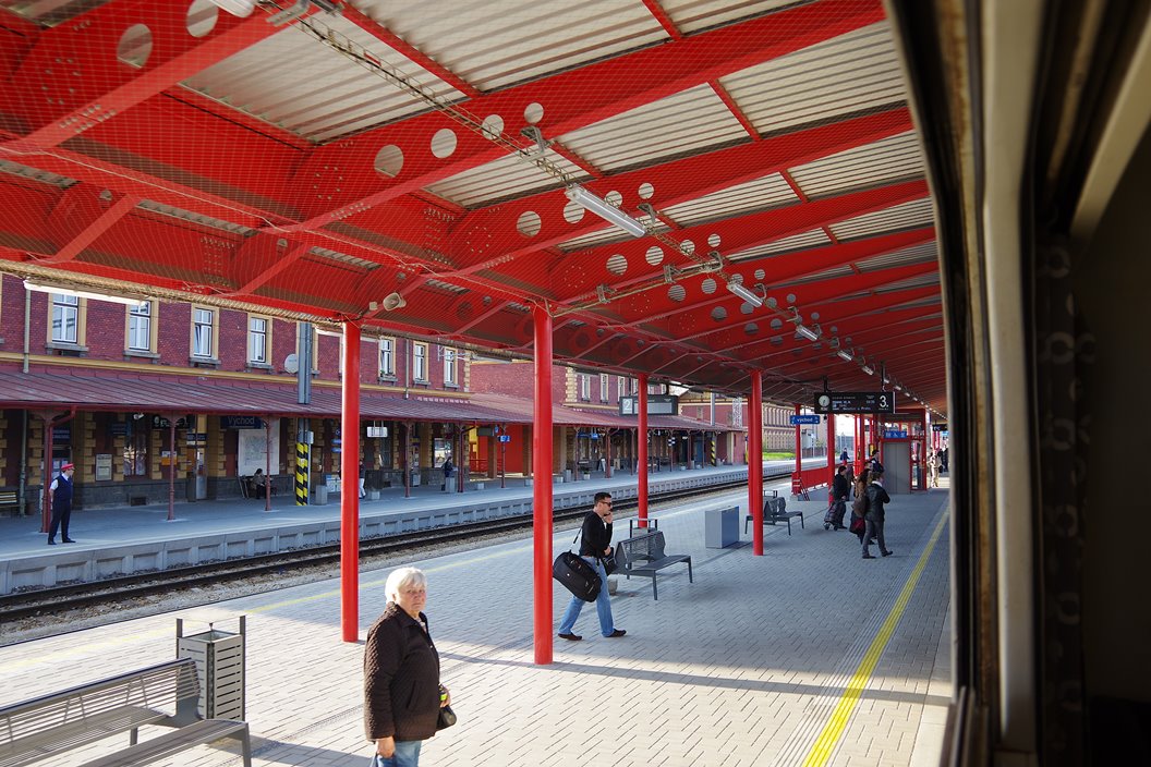 ホームに止まっているのは、気動車が客車を牽引するタイプの列車。このスタイルの列車はプラハ近郊でも見かけますが、なぜか引かれている客車は赤とクリームの旧式塗色のものが多いようです。